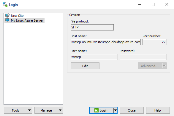 To connect to a virtual machine instance with SFTP, start WinSCP. Login dialog will appear. On the dialog: