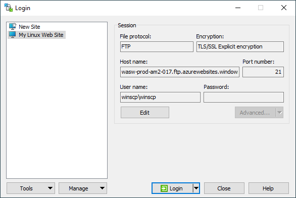 waws-prod-xxx-xxx.ftp.azurewebsites.windows.net. You can also paste a complete URL to select protocol, encryption and insert host name at once. - Enter the User name and the Password.