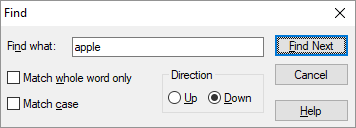 Press button Find next to start searching. If occurence of the string is found, view will be scrolled to reveal the string and the string itself will be highlighted. You can press it repeatedly to search for other occurences.