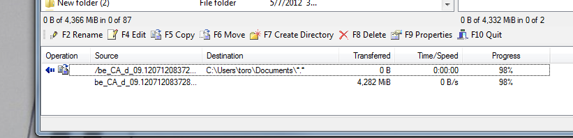 I am trying to transfer a large file using ftp, but it always fails. The transfer goes well for several hours (indicating an estimated completion time of 4-7 hours) but it never completes. Attached is a screen shot after ~12 hours. I also tried drag and drop; same outcome.