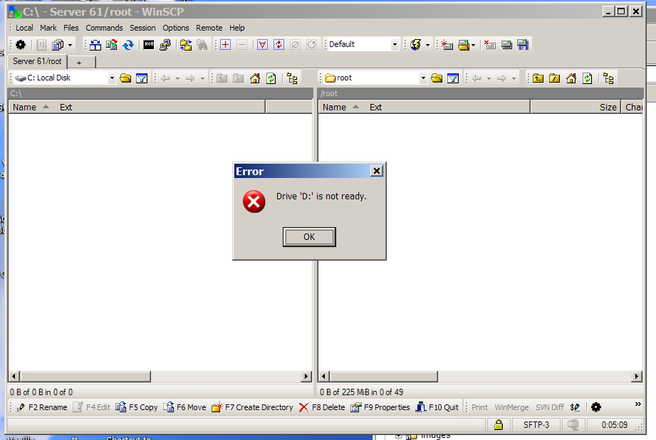 - Dismiss the screensaver, and enter password - WinSCP throws an error trying to connect to a disconnected drive: "Drive D: is not ready" in my case. The displayed local path is still C:..., but nothing is shown in either pane.