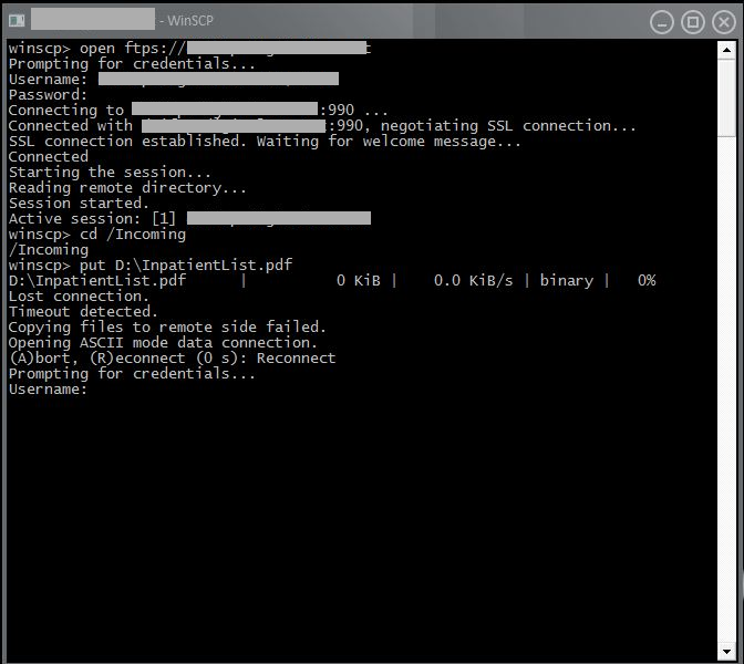 We are using the WinSCP product for one of our clients for FTP\SSL. The GUI version works great, no issues. The problem I am having is uploading with the CMD-Line version of the tool. I can make a connection via ssl using the cmd-line and I can even issue a change dir command, but I cannot get the cmd-line to put/upload a file. I have attached a screen shot for review. The settings are pretty basic, so I am not sure what is happening. Our FTP server is a Microsoft IIS 7.5 2008R2 server. The only firewall involved is our hardware firewall and all ports necessary are open for FTPS along with a block of data ports. As I stated the GUI version of WinSCP works fine, its the cmd-line I am having issues with. Unfortunately this is the clients requirements. I don't have any problems connecting with another cmd-line tool via ssl and uploading (Not sure if it is OK to post the name of that product).