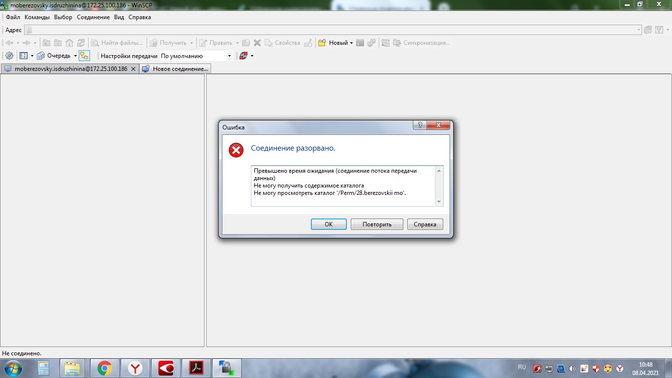 I can click "Reconnect" in these dialogs but it never works. I just get the same error message again. I can also not manually connect to this device, since WinSCP will try to open that same directory again, which causes the same error.