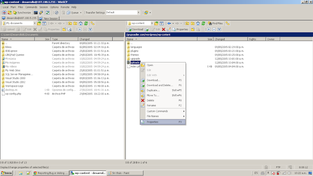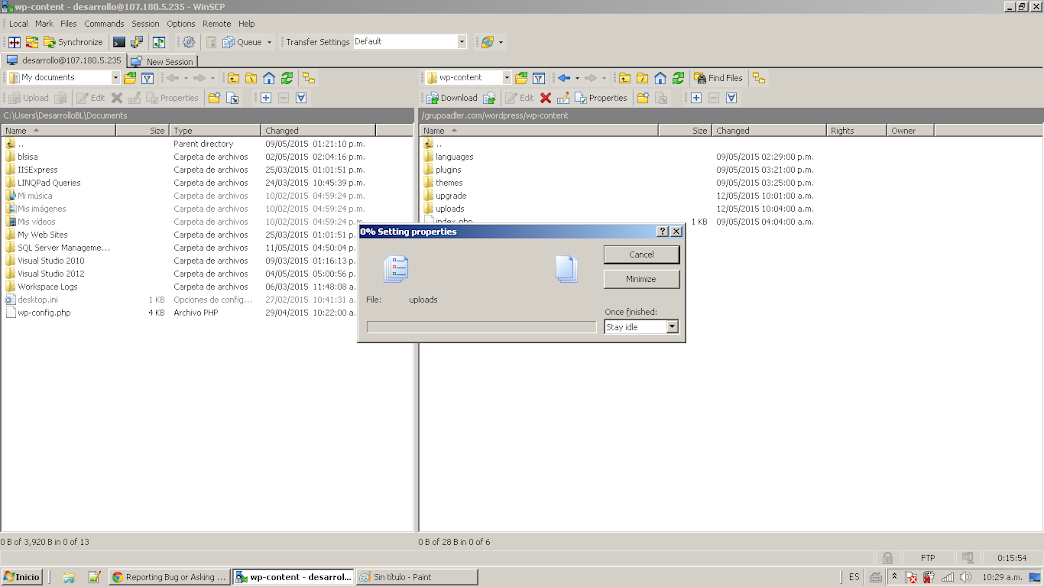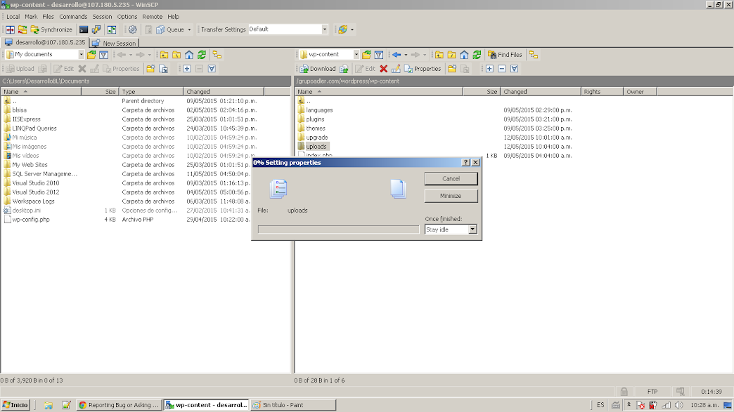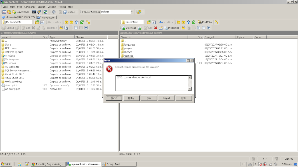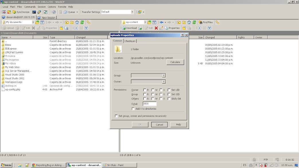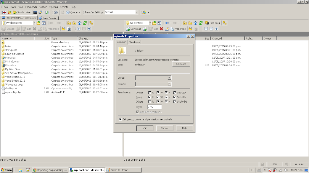 Can't change permission to folders nor files in the hosting server.