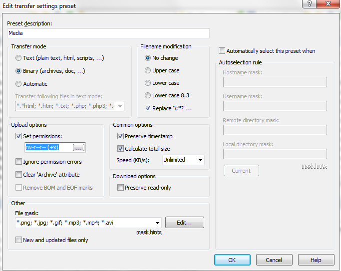 I'd like to automatically set media files to 644 because it would save me a lot of time and it's relatively safe. I tried setting up a transfer rule with a file mask for