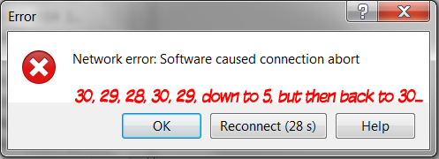 In this situation, WinScp will find that it cannot obtain an answer from the server, and will offer to reconnect, an answer that I'll click to accept.