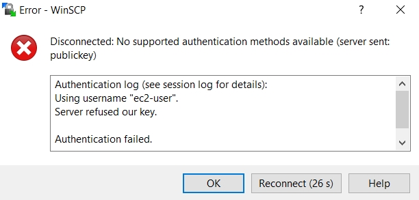 When attempting to login to WinSCP, I'm prompted for the Public DNS, the username (which I'm not sure is ec2-user, root, or ubuntu - so I've tried all three without luck) and the key. I've tried both the .pem and .ppk file, but in all cases, I get an error from AWS EC2.