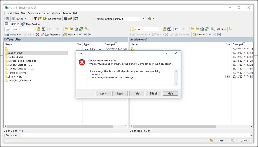 The fail is not instant though , a number of FLAC tracks appear to be copied before WinSCP complains, the result being a partially transferred / uploaded CD