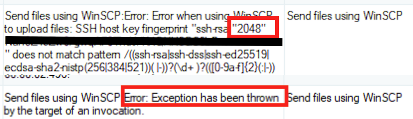 2. I created a SSIS package with parameters, so that during development the package would connect to a test server. Once deployed on a SQL server, I scheduled a package in which I adapted (override) the default parameters, in order to have winscp upload files to production server. As a result, the server fingerprint also changes, which is why I provided this value as a parameter. When entering the server fingerprint as a parameter in the scheduled package, I copy/pasted the value as I got it from WinSCP and got something like 'rsa 2048 xxxxxx'. The package would systematically fail upon scheduled execution and it took me some time to find root cause (see point 1). As it turns out, the SSIS package got a parameter value from the scheduled job in this format 'rsa "2048" xxxxx' (note the quotes surrounding the fingerprint key length), which WinSCP refused as it did not match the expected fingerprint format (regex expression). So while this is _NOT_ a WinSCP problem, I wanted to signal this and make my point for the change documented in point 1. If the demo code had given me the InnerException value, I would have found the root cause quicker.