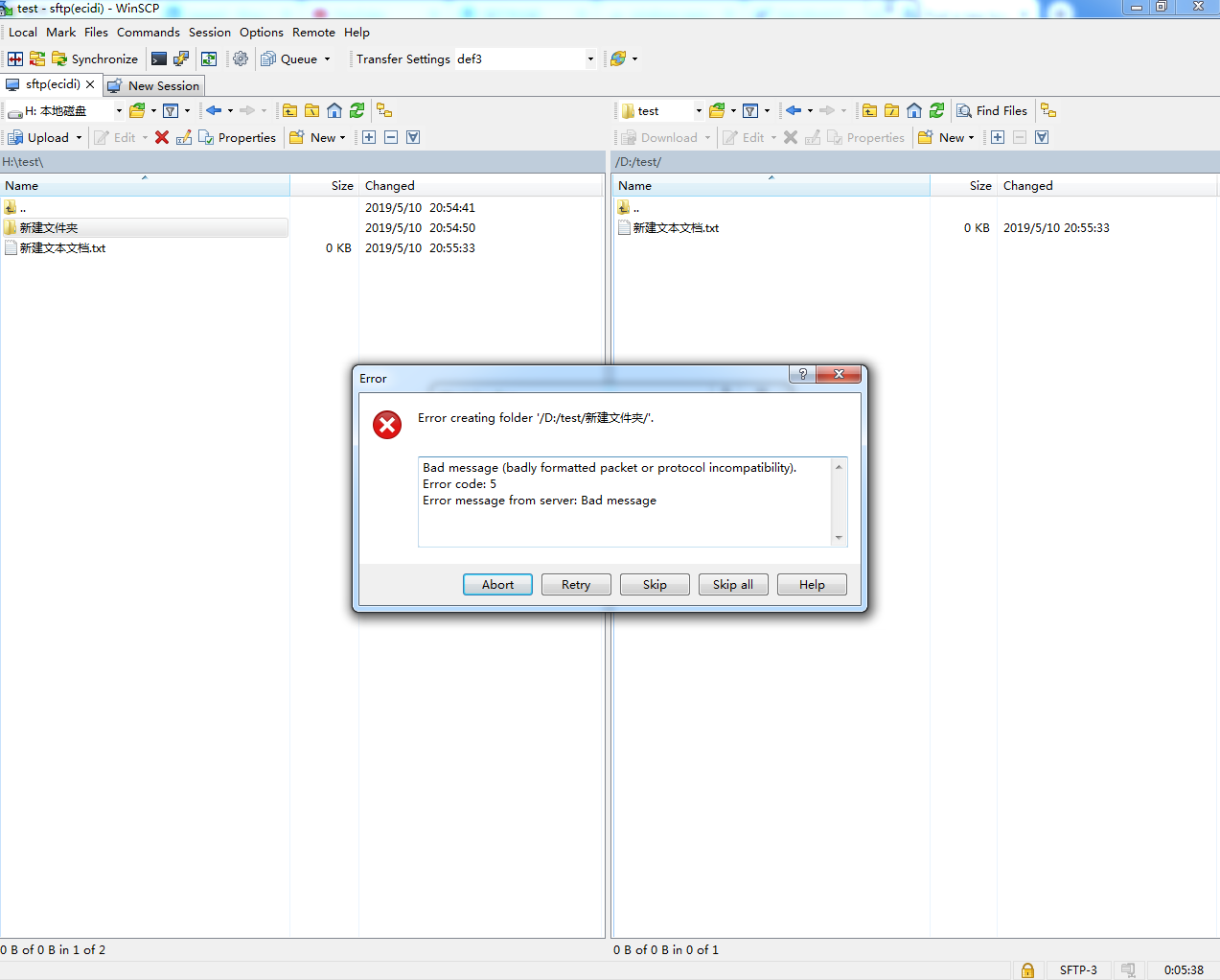 Hi, I'm trying to upload files and folders to a Windows Open-SSH server (using SFTP protocal). WinSCP succeed in uploading files (with English name or Chinese name). But failed to upload folders with Chinese name. And failed to show folders with Chinese name at the server.
