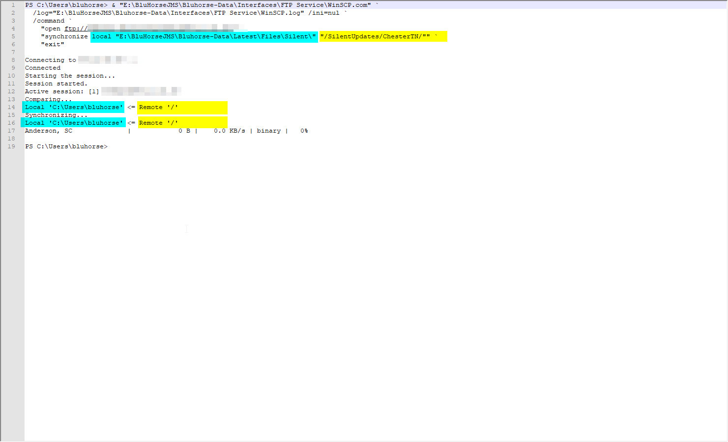 "synchronize local "E:\BluHorseJMS\Bluhorse-Data\Latest\Files\Silent\" "/SilentUpdates/ChesterTN/"" `