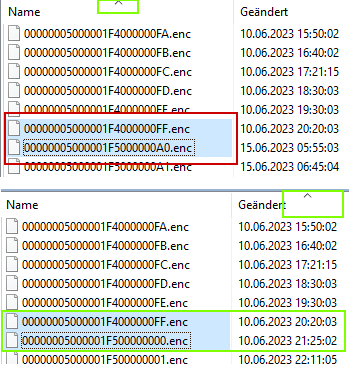 The alphabetical sorting of hexadecimal increasing filenames (that are created one after another and not touched again) does not match the time-sorting, which is unexpected.