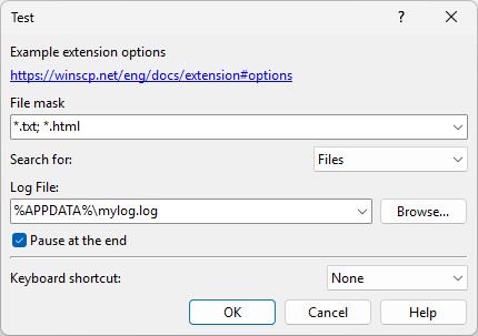 # @option - -config label "Example extension options" # @option - -config link https://winscp.net/eng/docs/extension#options # @option Mask -config textbox "&File mask" "*.txt; *.html" # @option SearchType -config dropdownlist "Search for:" -files ^ # -files="Files" -dirs="Directories" -both="Files and Directories" # @option LogFile -config file "&Log File:" "%APPDATA%\mylog.log" # @option Pause -config checkbox "&Pause at the end" -pause -pause