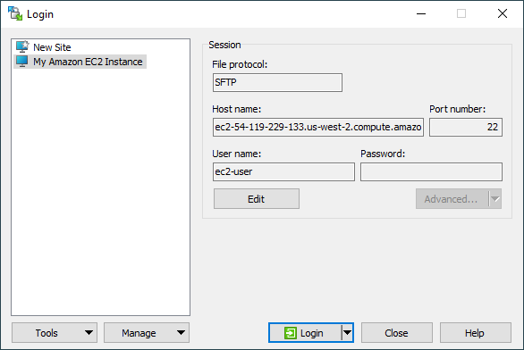 If you are managing a large amount of servers, and it is not feasible for you to save a site for each of them in WinSCP, consider using an user script that injects “Open in WinSCP” link to an Amazon EC2 management portal.