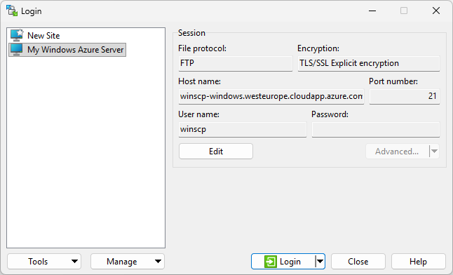 To connect to the virtual machine with FTPS, start WinSCP. Login dialog will appear. On the dialog: