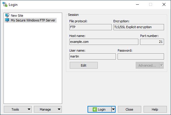 domain\username). - You may want to save your session details to a site so you do not need to type them in every time you want to connect. Press Save button and type site name.