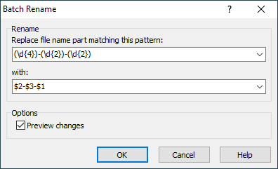 On the image, you can see a pattern ((\d{4})-(\d{2})-(\d{2})) and a replacement string ($2-$3-$1) that change date stamp in file names from the yyyy-mm-dd format to the mm-dd-yyyy format by changing an order of captured groups.