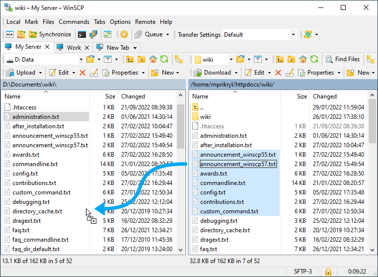The simplest way to download files is to drag them from remote panel of WinSCP to local panel or Windows File Explorer. See section Using Drag&drop (Mouse).