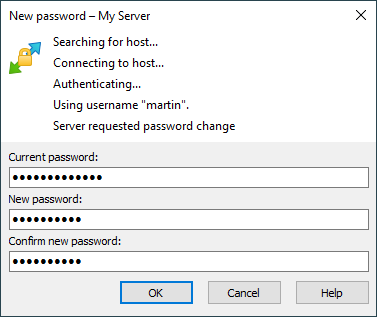 Note that the server may use keyboard interactive method for change password request. Then the prompts will differ.