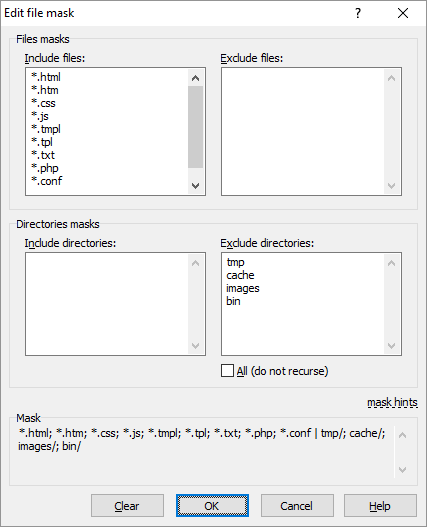 When File Mask dialog opens, individual masks in your file mask (if any) are separated into Include files, Exclude files, Include directories and Exclude directories groups. Each mask in every group is on a separate line.