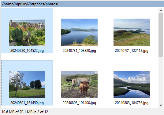The file panels offer several view styles. In both interfaces, Details and Thumbnails (latest beta version only) views are available. In Commander interface, to change view style use Local/Remote/Left/Right > View menu or toolbar icon. In Explorer interface, use View menu or toolbar icon. The Explorer interface additionally offers Large and Small Icons views.