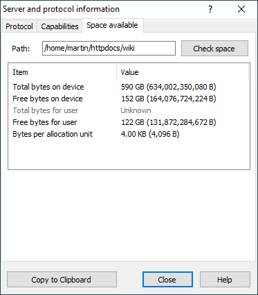 The Space available tab shows information about storage space for the current remote directory. You can request the information for another path by typing it to Path box and pressing Check space button.