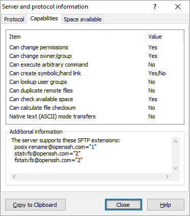 The list shows what the transfer protocol currently in use is capable of. Note that these are general information based on protocol and its version. The particular implementation (the actual server) can still lack some of the features.