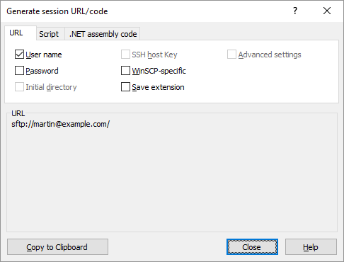 Check the SSH host key to include an SSH host key fingerprint into the URL. The option is available for an SFTP and an SCP (SSH-based) sessions only. The option is not available, if no session was opened to the host as the host key is not known yet. Note that some (most) SSH clients need not understand a session URL that includes the host key fingerprint.