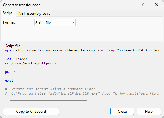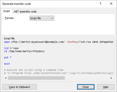 Use the Script tab to generate a WinSCP script template for the session or the file transfer.
