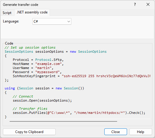 Session.PutFilesorSession.GetFiles. TheTransferOptionsclass instance will be constructed and set up, if any non-default transfer settings are used. TheOperationResultBase.Checkmethod will be called on results of the methods to throw an exception on any error.- If you had all files selected in the source panel, a code to upload all files from the source directory will be generated.