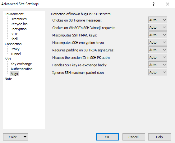 Each bug can be configured in three states. With Off WinSCP will assume that the server does not have the bug. With On WinSCP will assume that the server does have the bug. With Auto (default) WinSCP will try to guess whether or not the server has the bug.