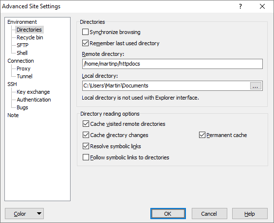 The Remote directory box defines the initial remote directory opened in panel. When Remember last used directory is ticked the path is updated whenever the session is closed. When the initial directory is not specified the user home directory is usually opened on startup. Note that this may not be true particularly for SFTP servers.