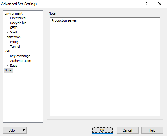 The Note page on the Advanced Site Settings dialog allows user to enter arbitrary note for a site. The note is shown on Login dialog, when the respective site is selected.