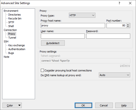 Many firewalls implement a less formal type of proxy in which a user can make a Telnet or TCP connection directly to the firewall machine and enter a command such as connect myhost.com 22 to connect through to an external host. Selecting Telnet allows you to tell WinSCP to use this type of proxy, with the precise command specified. This type of proxy is not supported for FTP, WebDAV and S3 protocols.