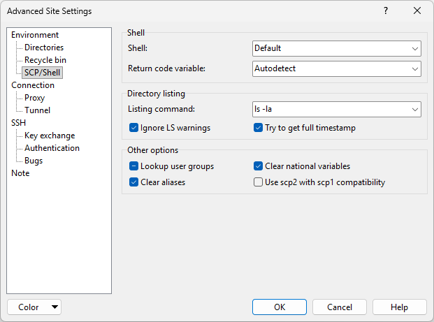 SCP/Shell tab allows user to configure shell specific options. Mostly it helps WinSCP to modify remote environment to match its requirements. The options are mainly used when working with SCP protocol. Even if you are using SFTP protocol, some of the options are made available for you, in case you are using some feature that require separate shell session.1