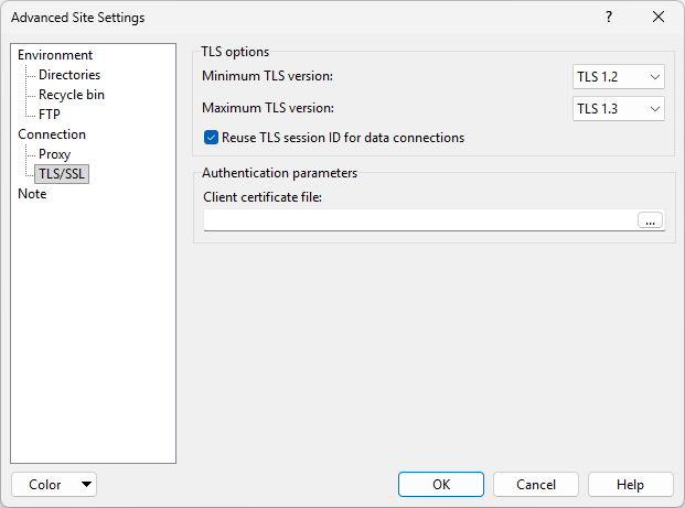 The TLS/SSL page on the Advanced Site Settings dialog allows you to configure options of TLS protocol for FTPS, WebDAVS and S3.