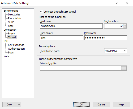 Use the Private key file box to specify local path to your private key file if you are going to use public key authentication for tunnel. For details see documentation for private key for main session.
