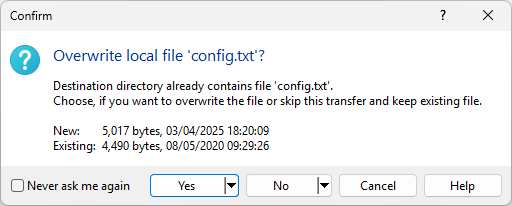 | New name | Prompts for new file name to save the source file to in destination directory; and keeps the destination file. This action is available in drop-down menu of No button. You can also Ctrl+Click the No button. The action is supported with SFTP and FTP protocols only. |