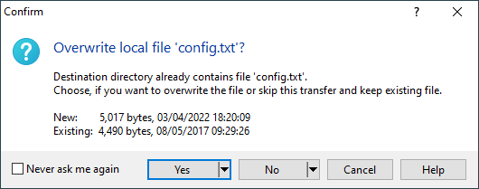 | New name | Prompts for new file name to save the source file to in destination directory; and keeps the destination file. This action is available in drop-down menu of No button. You can also Ctrl+Click the No button. The action is supported with SFTP and FTP protocols only. |