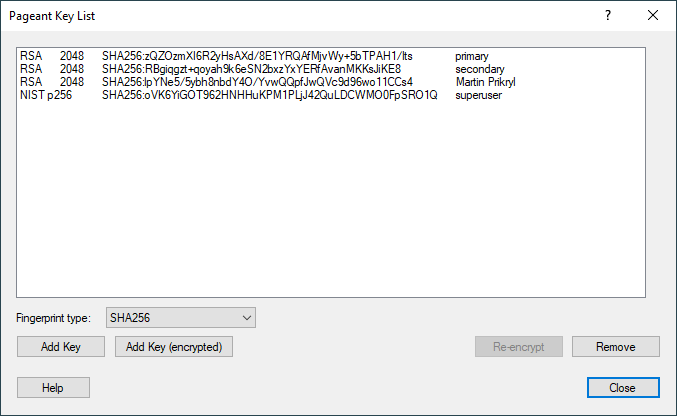 To add a key to Pageant in this encrypted form, press the Add Key (encrypted) button in the Pageant main window, or alternatively right-click on the Pageant icon in the system tray and select Add Key (encrypted) from there. Pageant will bring up a file dialog, in just the same way as it would for the plain Add Key button. But it won’t ask for a passphrase. Instead, the key will be listed in the main window with (encrypted) after it.