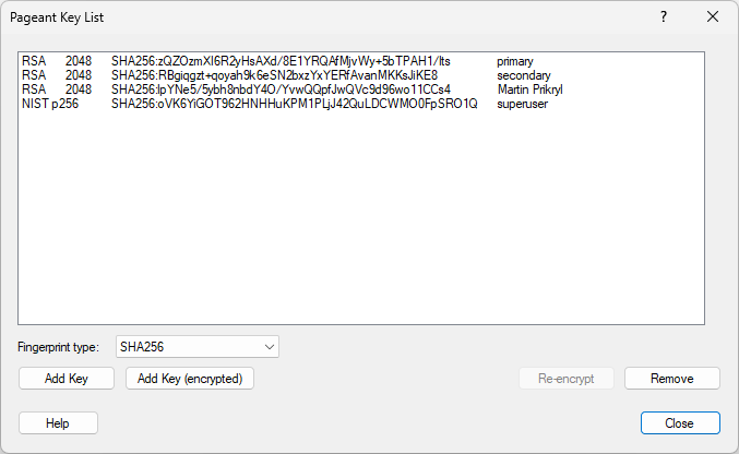 The Pageant main window appears when you left-click on the Pageant system tray icon, or alternatively right-click and select View Keys from the menu. You can use it to keep track of what keys are currently loaded into Pageant, and to add new ones or remove the existing keys.