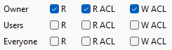 The rows of checkboxes are used to set/unset specific permissions for the Owner (the owner of the file); the Users (anyone with an AWS account); and Everyone (public access). The label R stands for “read permissions for the file”, R ACL for “read permissions for the file ACL” and W ACL for “write permissions for the file ACL”.