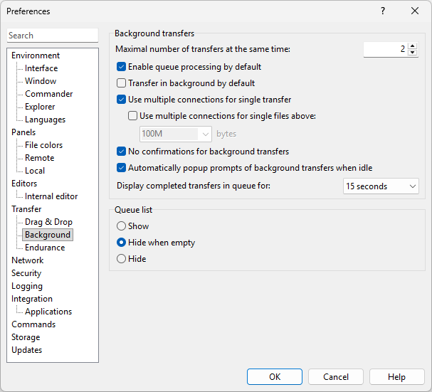 Use Queue List box to control visibility of background transfers queue list. Special view state Hide when Empty (default state) makes the queue list visible, when there is some background transfer in progress or scheduled, only.