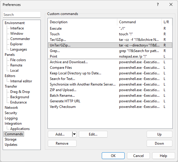 The Description column shows a name of the command/extension as will appear in Files > Custom Commands menu. The Command column show the command itself. The L/R column shows L for local commands or R for remote commands.
