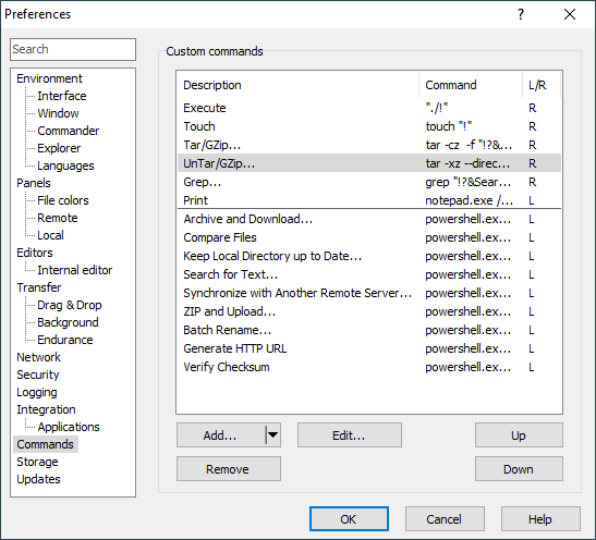 The Description column shows a name of the command/extension as will appear in File(s) > Custom Commands menu. The Command column show the command itself. The L/R column shows L for local commands or R for remote commands.