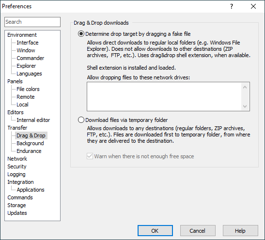 The Drag&Drop page on the Preferences dialog allows you to configure behavior of WinSCP when transferring files using drag&drop to other applications. It does not affect drag&drop within WinSCP (for example between local and remote panels of Commander interface).