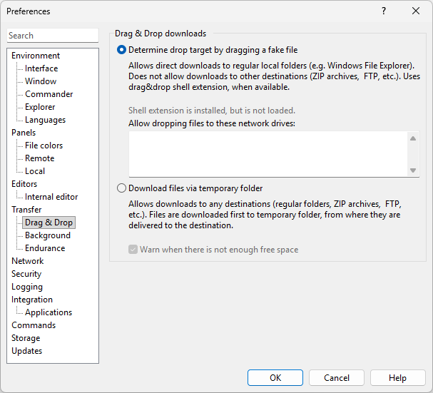 The Drag&Drop page on the Preferences dialog allows you to configure behavior of WinSCP when transferring files using drag&drop to other applications. It does not affect drag&drop within WinSCP (for example between local and remote panels of Commander interface).