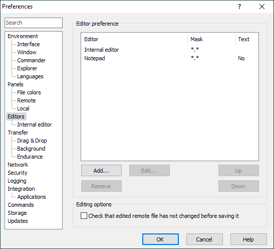 The Editor tab on the Preferences dialog allows you to configure options for both internal and external editors. Some of the options also affect opening remote files in an associated local application.