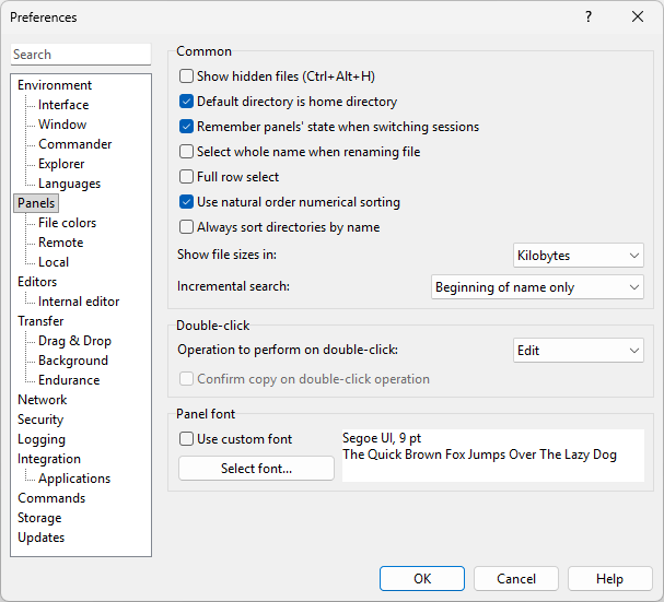 The Panels page on the Preferences dialog allows you to configure display and behavioral options of file panels.
