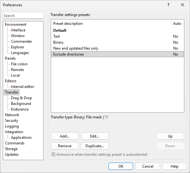 The Transfer page on the Preferences dialog allows you to configure default transfer settings and transfer settings presets (including autoselection rules).